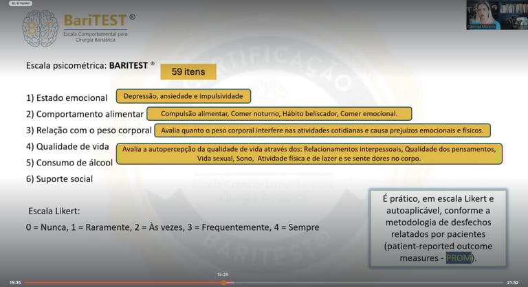 • Instrumentos e Métodos de Precisão: Como integrar a entrevista clínica, os testes projetivos e o uso do BariTEST® — instrumento que otimiza a avaliação de humor, comportamento alimentar, qualidade de vida e suporte social em uma única ferramenta.